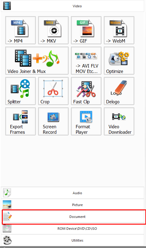 • Trên giao diện chính, bạn tìm đến khu vực hoặc tab chứa các chức năng liên quan đến tài liệu (Document) hoặc PDF. (Trong một số phiên bản, tính năng này có thể nằm trong mục Utility/Tiện ích hoặc Document/Tài liệu).