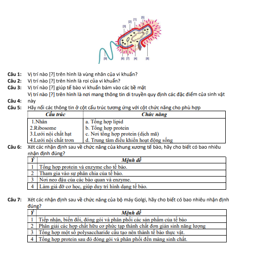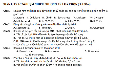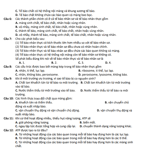 Đề Cuối Học Kì 1 Sinh Học 10 giữ vai trò quan trọng trong việc giúp học sinh làm quen với cấu trúc đề thi chính thức và rèn luyện kỹ năng ghi nhớ, phân tích cũng như vận dụng kiến thức sinh học theo chuẩn đánh giá mới. Khi kết hợp ôn tập cùng hệ thống tài liệu trên detracnghiem.edu.vn, học sinh được tiếp cận kho câu hỏi phong phú, phân hóa theo các mức độ nhận biết, thông hiểu và vận dụng, kèm đáp án và giải thích chi tiết. Việc luyện đề thường xuyên không chỉ giúp củng cố kiến thức lý thuyết mà còn phát triển tư duy khoa học, khả năng liên hệ thực tiễn sinh học, từ đó tạo sự tự tin trước các kỳ kiểm tra quan trọng trong năm học Trắc nghiệm ôn tập lớp 10.