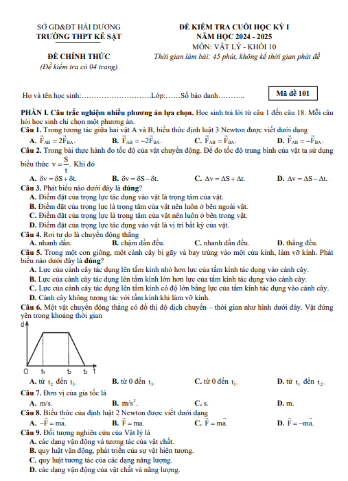Đề cuối học kì 1 Vật lí 10 năm 2024 – 2025 trường THPT Kẻ Sặt – Hải Dương