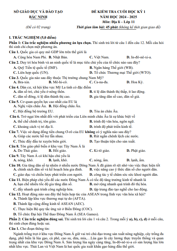 Đề cuối học kỳ 1 Địa lí 11 năm học 2024 – 2025 sở GD&ĐT Bắc Ninh