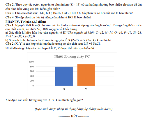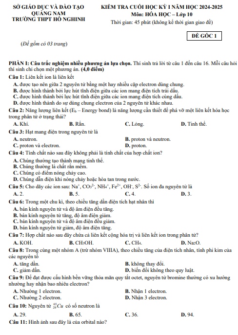 Đề Cuối Học Kỳ 1 Hóa Học 10 Năm 2024 – 2025 Trường THPT Hồ Nghinh – Quảng Nam là đề kiểm tra thuộc môn Hóa học lớp 10, được xây dựng nhằm đánh giá mức độ nắm vững kiến thức và kỹ năng của học sinh sau khi hoàn thành chương trình học kỳ I. Đây là đề ôn tập – đánh giá định kỳ do thầy Nguyễn Văn Hùng, giáo viên giảng dạy Hóa học tại Trường THPT Hồ Nghinh biên soạn trong năm học 2024 – 2025. Nội dung đề thi bám sát chương trình Hóa học 10 mới, tập trung vào các chuyên đề trọng tâm như cấu tạo nguyên tử, bảng tuần hoàn các nguyên tố hóa học, liên kết hóa học và các dạng bài tập tính toán cơ bản, giúp học sinh hệ thống hóa kiến thức đã học trong học kỳ đầu.