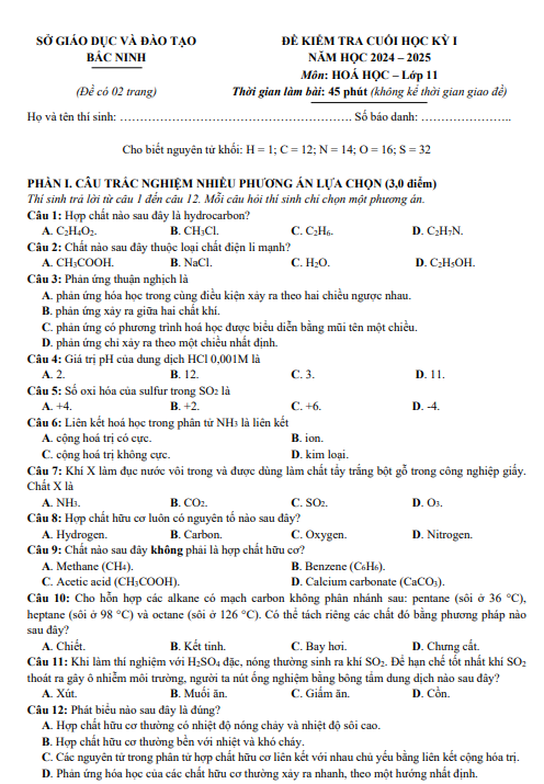 Đề cuối học kỳ 1 Hóa học 11 năm học 2024 – 2025 sở GD&ĐT Bắc Ninh