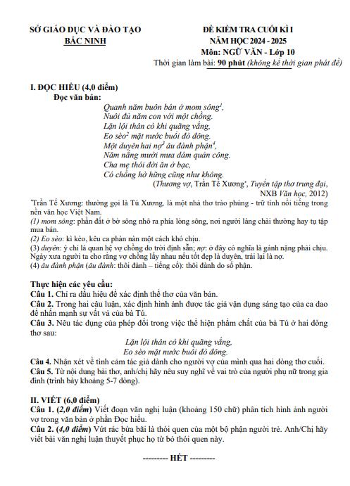 Đề Cuối Học Kỳ 1 Ngữ Văn 10 Năm Học 2024 – 2025 Sở GD&ĐT Bắc Ninh là đề kiểm tra thuộc môn Ngữ văn lớp 10, được xây dựng theo định hướng chung của Sở GD&ĐT Bắc Ninh nhằm đánh giá toàn diện năng lực đọc hiểu, viết và cảm thụ văn học của học sinh sau học kỳ I trên phạm vi toàn tỉnh. Đây là đề đánh giá định kỳ cấp sở, thường được sử dụng làm đề chung hoặc đề tham khảo tại nhiều trường THPT, tiêu biểu như Trường THPT Hàn Thuyên. Đề được cô Nguyễn Thị Hương, giáo viên Ngữ văn của nhà trường, trực tiếp tham gia biên soạn và hướng dẫn ôn tập trong năm học 2024 – 2025. Nội dung đề bám sát chương trình Ngữ văn 10 mới, tập trung vào các mạch kiến thức trọng tâm như đọc hiểu văn bản văn học – nghị luận, tiếng Việt và kỹ năng viết bài nghị luận xã hội, nghị luận văn học.