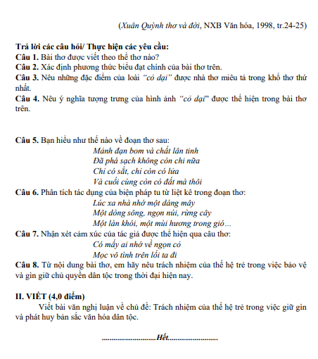 Đề cuối học kỳ 1 Ngữ văn 11 năm 2024 – 2025 trường THPT Hồ Nghinh – Quảng Nam là bài kiểm tra định kì quan trọng của môn Ngữ văn, được xây dựng nhằm đánh giá toàn diện năng lực đọc hiểu, cảm thụ văn học và kỹ năng viết của học sinh lớp 11 sau khi hoàn thành chương trình học kì I. Đây là đề thi Ngữ văn 11 do tổ Ngữ văn Trường THPT Hồ Nghinh (huyện Duy Xuyên, tỉnh Quảng Nam) biên soạn, dưới sự phụ trách chuyên môn của cô Trần Thị Thanh Thủy – giáo viên Ngữ văn có nhiều năm kinh nghiệm giảng dạy. Nội dung đề bám sát chương trình Ngữ văn 11 mới, tập trung vào đọc hiểu văn bản văn học và văn bản thông tin, cùng các yêu cầu viết đoạn, bài nghị luận xã hội và nghị luận văn học theo định hướng phát triển năng lực. Đề thi đã được tổng hợp và đăng tải trên detracnghiem.edu.vn để học sinh thuận tiện ôn tập.