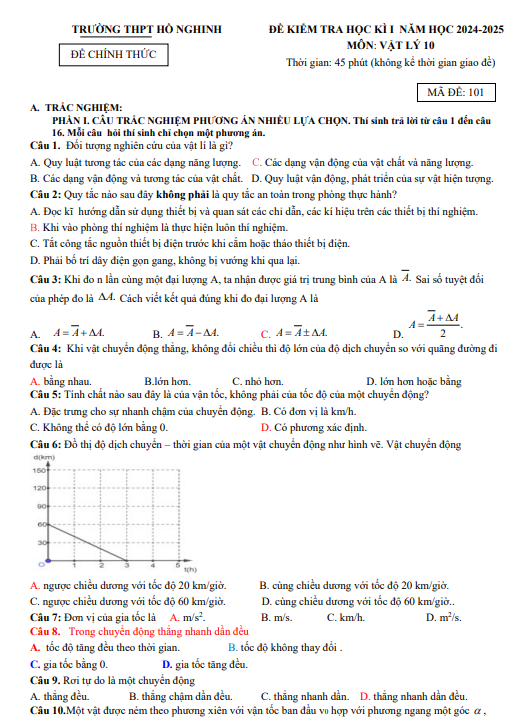 Đề Cuối Học Kỳ 1 Vật Lí 10 Năm 2024 – 2025 Trường THPT Hồ Nghinh – Quảng Nam là đề kiểm tra thuộc môn Vật lí lớp 10, được xây dựng nhằm đánh giá mức độ nắm vững kiến thức và khả năng vận dụng các quy luật vật lí của học sinh sau khi hoàn thành chương trình học kỳ I. Đây là đề ôn tập – đánh giá định kỳ do thầy Nguyễn Văn Hùng, giáo viên giảng dạy môn Vật lí tại Trường THPT Hồ Nghinh trực tiếp biên soạn trong năm học 2024 – 2025. Nội dung đề thi bám sát chương trình Vật lí 10 mới, tập trung vào các chuyên đề trọng tâm như mở đầu về Vật lí, chuyển động thẳng, vận tốc – gia tốc, đồ thị chuyển động và các dạng bài tập định lượng cơ bản.