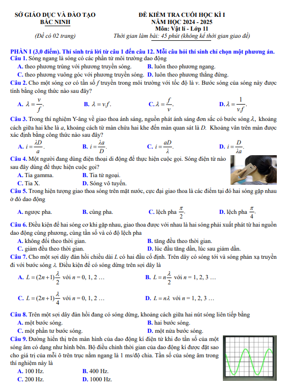 Đề cuối học kỳ 1 Vật lí 11 năm học 2024 – 2025 Sở GD&ĐT Bắc Ninh là bài kiểm tra định kì quan trọng của môn Vật lí, được xây dựng nhằm đánh giá mức độ nắm vững kiến thức và năng lực vận dụng của học sinh lớp 11 sau khi hoàn thành chương trình học kì I. Đây là đề thi Vật lí 11 do Sở GD&ĐT Bắc Ninh ban hành theo cấu trúc chung toàn tỉnh, với sự tham gia biên soạn của đội ngũ giáo viên cốt cán, tiêu biểu là thầy Nguyễn Văn Hưng – giáo viên Vật lí Trường THPT Hàn Thuyên (TP. Bắc Ninh). Nội dung đề tập trung vào các chuyên đề trọng tâm như dao động điều hòa, các đại lượng đặc trưng của dao động, con lắc lò xo, con lắc đơn và những bài toán vận dụng cơ bản theo chương trình Vật lí 11 học kì I. Đề thi đã được tổng hợp và đăng tải trên detracnghiem.edu.vn để hỗ trợ học sinh ôn tập hiệu quả.