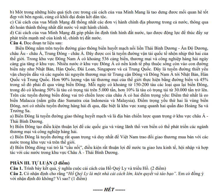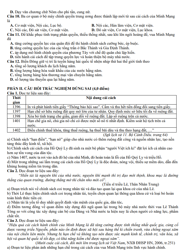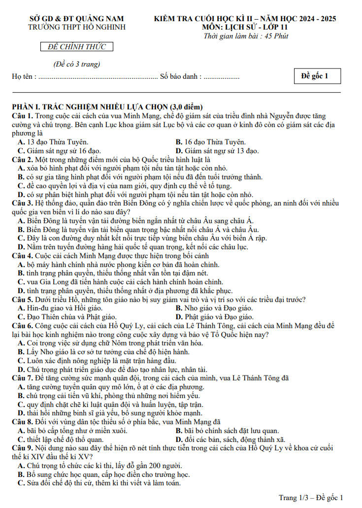 Đề cuối học kỳ 2 Lịch sử 11 năm 2024 – 2025 trường THPT Hồ Nghinh – Quảng Nam