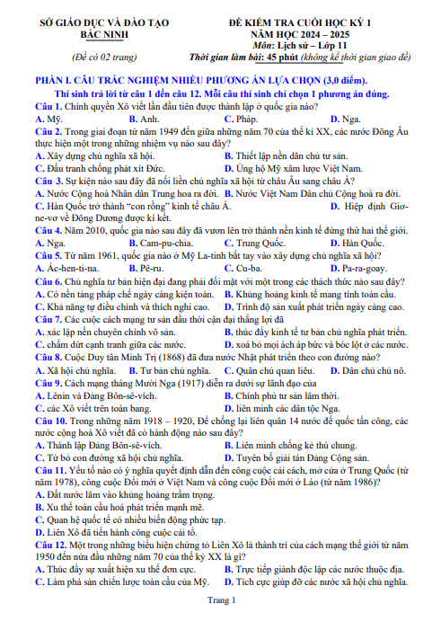 Đề cuối học kỳ I Lịch sử 11 năm học 2024 – 2025 Bắc Ninh