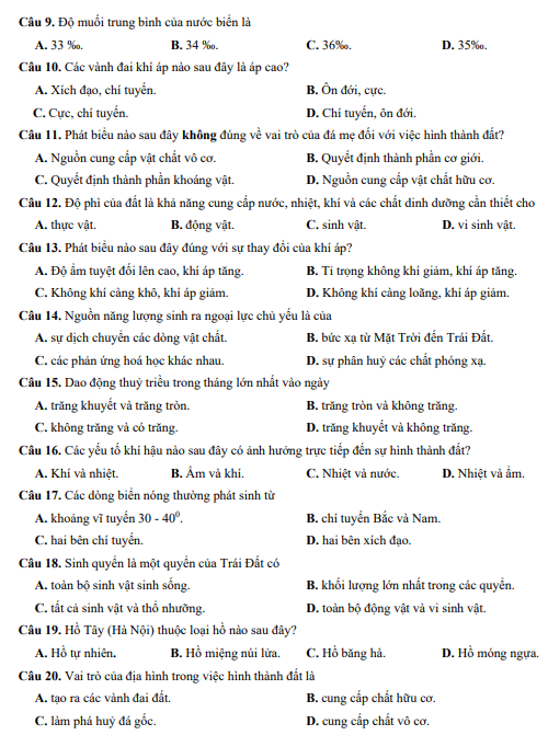 Đề Cuối Kì 1 Địa Lí 10 giữ vai trò quan trọng trong việc giúp học sinh làm quen với cấu trúc đề thi chính thức và rèn luyện kỹ năng làm bài hiệu quả. Khi ôn tập trên nền tảng detracnghiem.edu.vn, học sinh được tiếp cận hệ thống câu hỏi đa dạng, phân hóa rõ ràng theo các mức độ nhận biết, thông hiểu và vận dụng, kèm đáp án và lời giải chi tiết. Việc luyện đề thường xuyên không chỉ giúp các em hệ thống hóa kiến thức đã học mà còn nâng cao khả năng phân tích bản đồ, số liệu và tư duy địa lí, từ đó tự tin hơn khi bước vào các kỳ kiểm tra quan trọng trong năm học Trắc nghiệm ôn tập lớp 10.