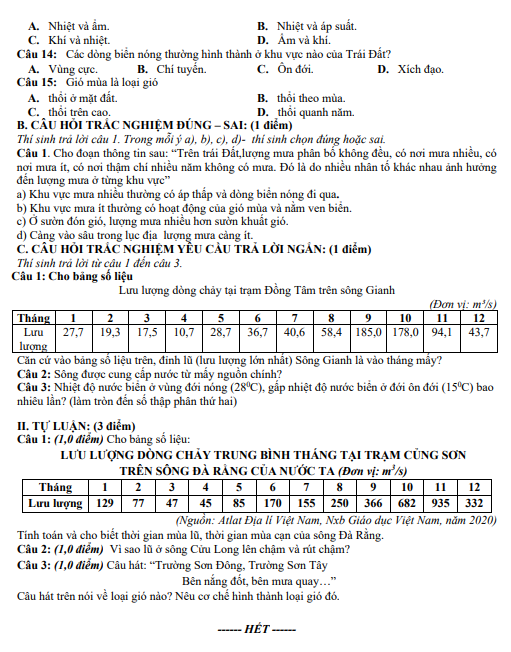 Đề cuối kì 1 Địa lí 10 năm 2024 – 2025 trường THPT Nguyễn Huệ – Quảng Nam