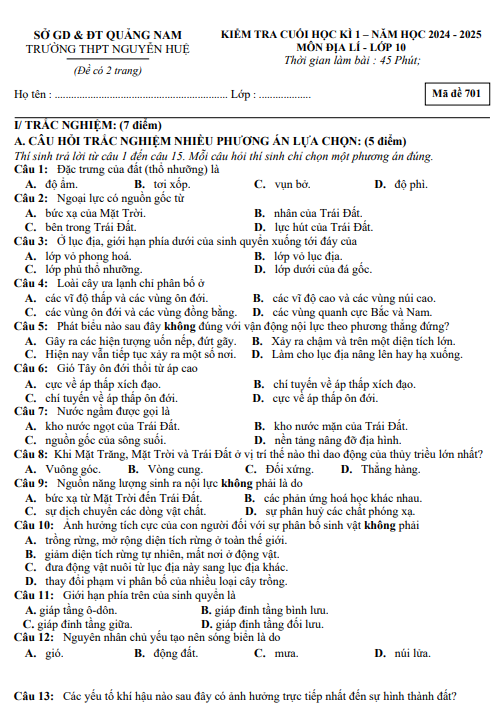 Đề cuối kì 1 Địa lí 10 năm 2024 – 2025 trường THPT Nguyễn Huệ – Quảng Nam