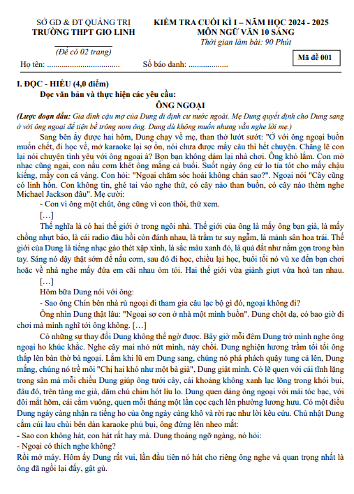 Đề cuối kì 1 Ngữ Văn 10 năm 2024 – 2025 trường THPT Gio Linh – Quảng Trị