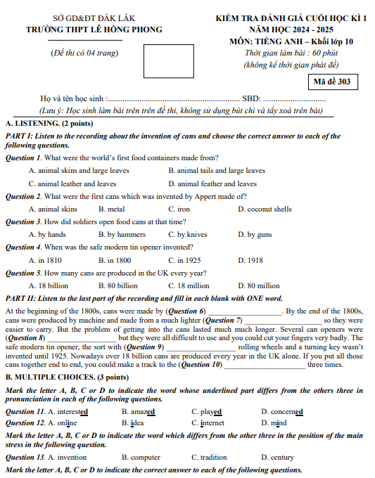 Đề cuối kì 1 Tiếng Anh 10 năm 2024 – 2025 trường THPT Lê Hồng Phong – Đắk Lắk