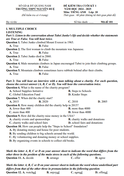 Đề cuối kì 1 Tiếng Anh 10 năm 2024 – 2025 trường THPT Nguyễn Huệ – Quảng Nam