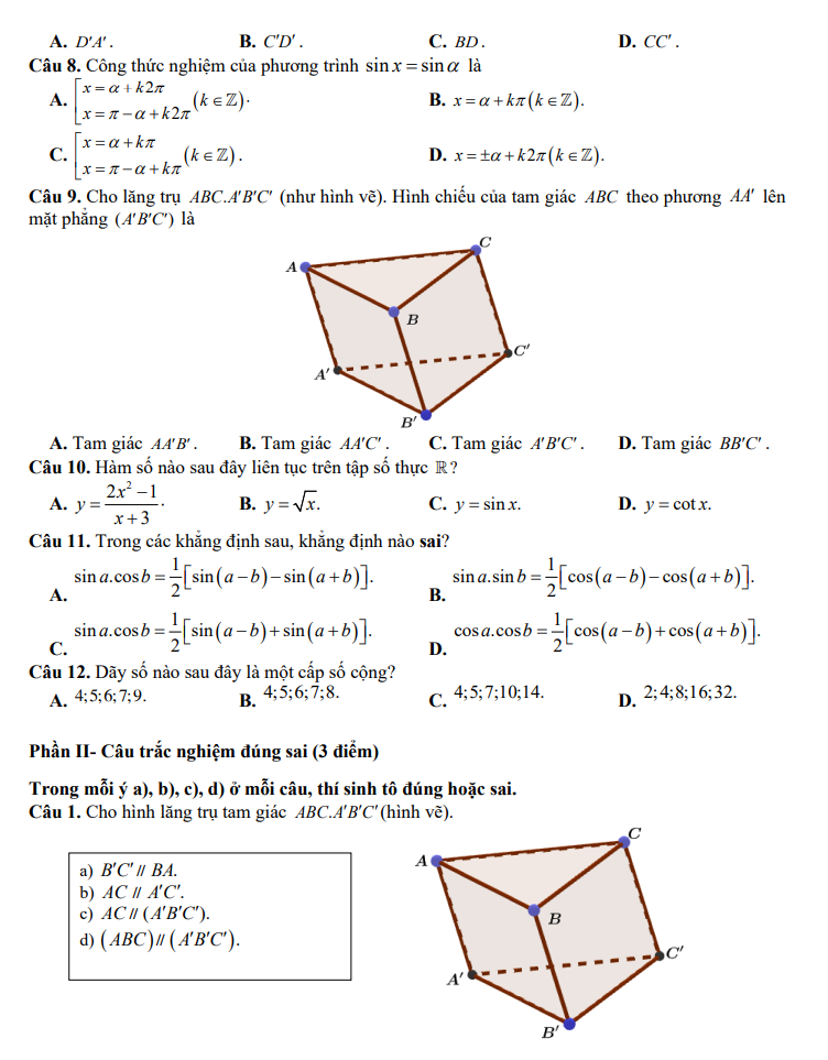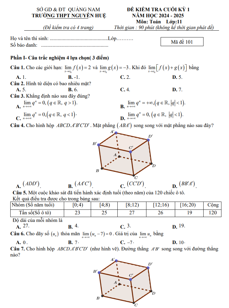 Đề cuối kì 1 Toán 11 năm 2024 – 2025 trường THPT Nguyễn Huệ – Quảng Nam Có Đáp Án