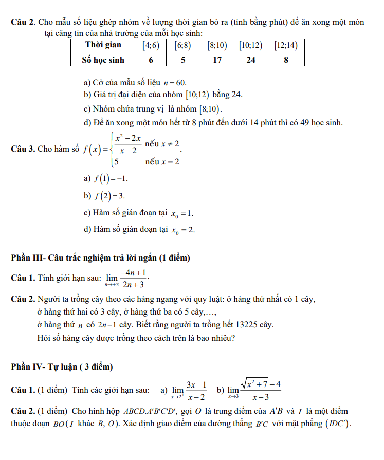 Đề cuối kì 1 Toán 11 có cấu trúc rõ ràng, hệ thống câu hỏi được phân hóa hợp lý từ mức độ nhận biết, thông hiểu đến vận dụng và vận dụng cao, giúp học sinh làm quen với dạng đề thi cuối kỳ chính thức. Khi luyện tập đề thi này trên detracnghiem.edu.vn, học sinh có thể làm bài trực tuyến, theo dõi kết quả chi tiết và xem đáp án kèm lời giải cụ thể cho từng câu hỏi. Nhờ đó, người học dễ dàng nhận ra những phần kiến thức còn yếu để kịp thời bổ sung và nâng cao kỹ năng giải toán. Đây là nguồn tài liệu tham khảo hữu ích cho quá trình ôn tập và rèn luyện với Trắc nghiệm ôn tập lớp 11.