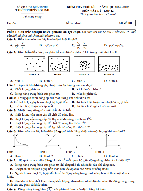 Đề cuối kì 1 Vật lí 12 năm 2024 – 2025 trường THPT Gio Linh – Quảng Trị