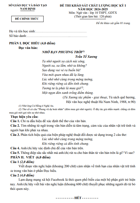 Đề Học Kỳ 1 Ngữ Văn 10 Năm Học 2024 – 2025 Sở GD&ĐT Nam Định là đề kiểm tra thuộc môn Ngữ văn lớp 10, được xây dựng theo định hướng chung của Sở GD&ĐT Nam Định nhằm đánh giá năng lực đọc hiểu, viết và cảm thụ văn học của học sinh sau học kỳ I trên phạm vi toàn tỉnh. Đây là đề đánh giá định kỳ cấp sở, thường được sử dụng làm đề chung hoặc đề tham khảo tại nhiều trường THPT, trong đó có Trường THPT Lê Hồng Phong. Đề được thầy Nguyễn Văn Quân, giáo viên Ngữ văn của nhà trường, trực tiếp tham gia biên soạn và hướng dẫn ôn tập trong năm học 2024 – 2025. Nội dung đề bám sát chương trình Ngữ văn 10 mới, tập trung vào các mạch kiến thức trọng tâm như đọc hiểu văn bản văn học – nghị luận, tiếng Việt và kỹ năng làm văn.