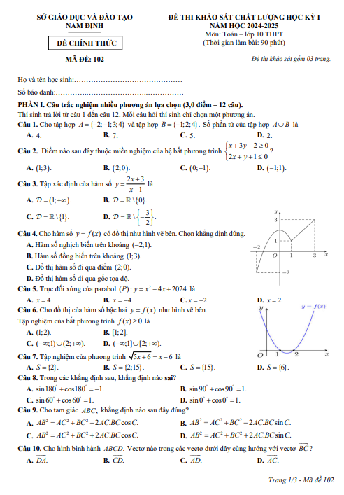 Đề học kỳ 1 Toán 10 năm học 2024 – 2025 sở GD&ĐT Nam Định