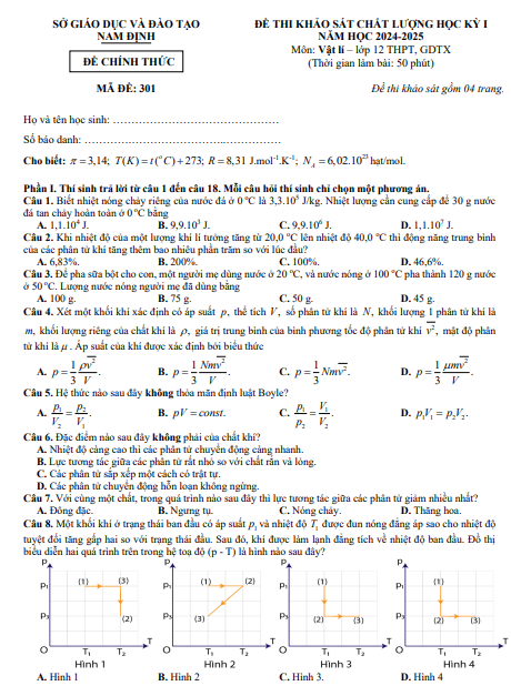 Đề học kỳ 1 Vật lí 12 năm học 2024 – 2025 sở GD&ĐT Nam Định