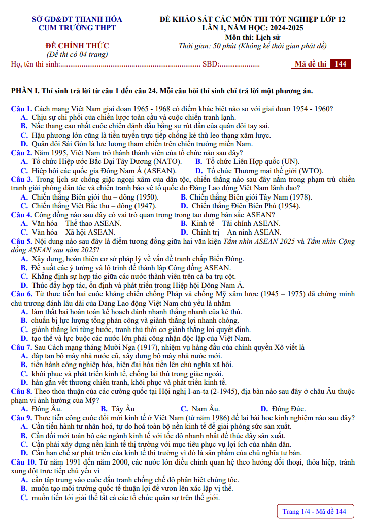 Đề khảo sát thi TN THPT 2025 môn Lịch sử lần 2 cụm trường THPT Thanh Hóa