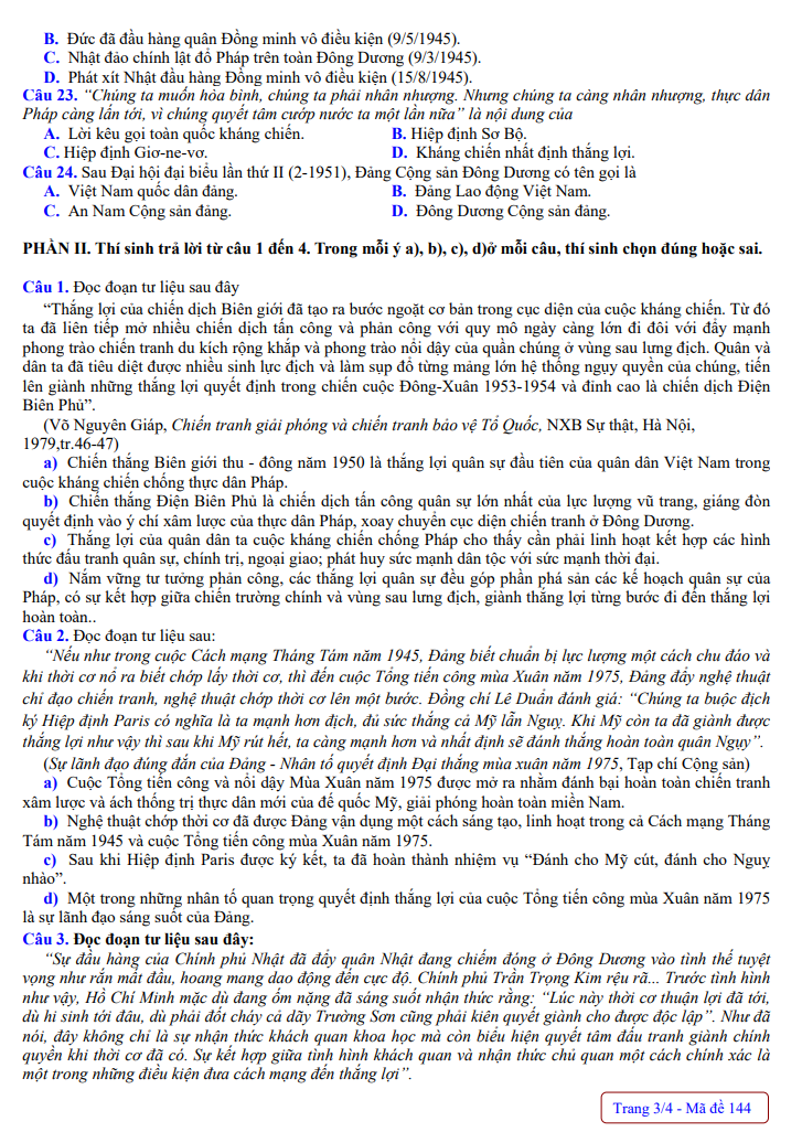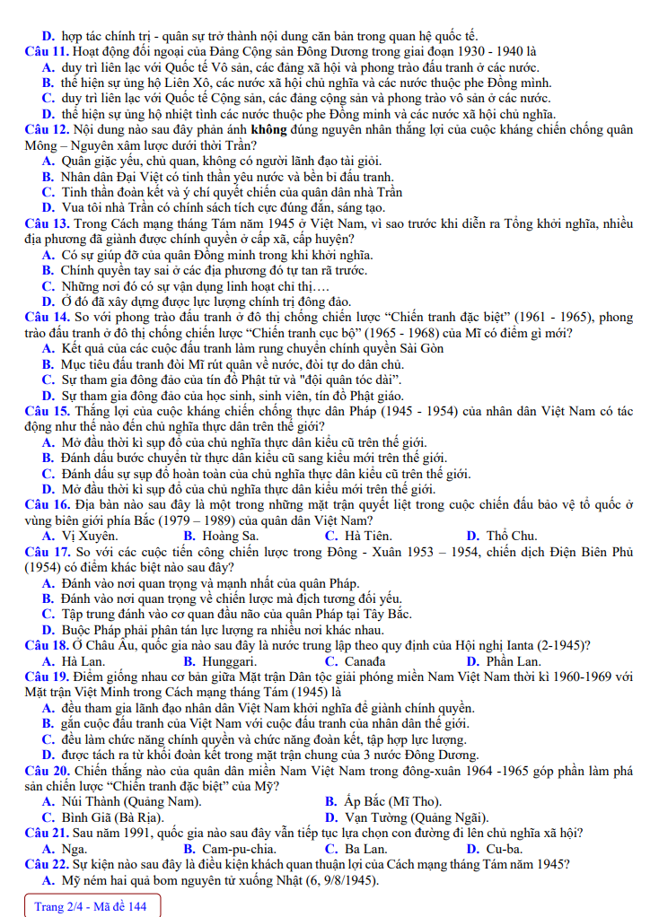 Đề thi được xây dựng dựa trên định hướng và cấu trúc của Bộ GD&ĐT, bao quát các nội dung trọng tâm: lịch sử Việt Nam hiện đại, quá trình đấu tranh giành độc lập, hai cuộc kháng chiến bảo vệ Tổ quốc, công cuộc xây dựng – đổi mới đất nước, cùng những sự kiện quan trọng trong lịch sử thế giới. Hệ thống câu hỏi được thiết kế theo các mức độ khác nhau, giúp học sinh nâng cao tư duy phân tích, tổng hợp và tối ưu hóa kỹ năng làm bài trong giai đoạn ôn tập chuẩn bị cho kỳ thi THPT năm 2025.