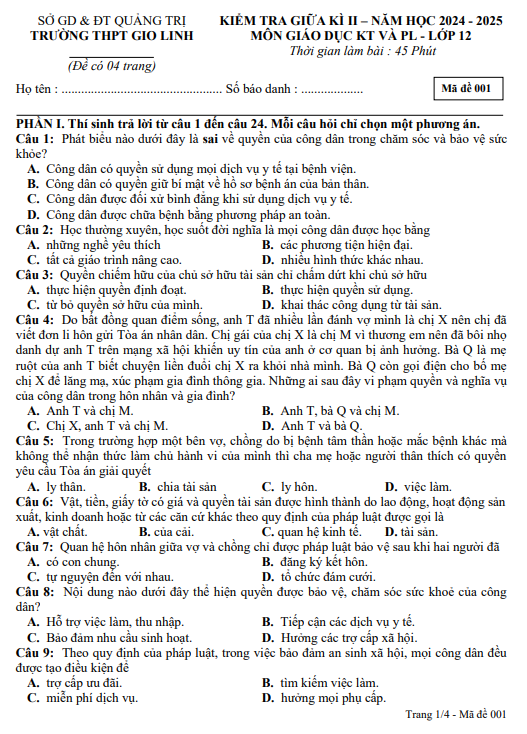 Đề Thi Giữa Kì 2 GDKT&PL 12 năm học 2024 – 2025 là đề kiểm tra thuộc môn Giáo dục Kinh tế và Pháp luật lớp 12, được xây dựng nhằm đánh giá mức độ nắm vững kiến thức của học sinh trong giai đoạn giữa học kì II. Đây là đề kiểm tra giữa kì do Trường THPT Gio Linh, trực thuộc Sở GD&ĐT Quảng Trị, xây dựng và áp dụng trong năm học 2024 – 2025. Nội dung đề thi được biên soạn theo chương trình sách GDKT&PL 12, tập trung vào các chuyên đề trọng tâm như công dân với pháp luật, quyền và nghĩa vụ cơ bản của công dân, pháp luật với phát triển kinh tế – xã hội bền vững và trách nhiệm pháp lý của công dân. Hệ thống câu hỏi trắc nghiệm môn KTPL 12 được sắp xếp từ mức độ nhận biết đến vận dụng, giúp học sinh củng cố kiến thức một cách toàn diện.