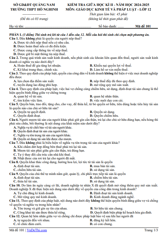 Đề Thi Giữa Kì 2 GDKT&PL 12 năm học 2024 – 2025 là đề kiểm tra thuộc môn Giáo dục Kinh tế và Pháp luật lớp 12, được xây dựng nhằm đánh giá mức độ nắm vững kiến thức của học sinh trong giai đoạn giữa học kì II. Đây là đề kiểm tra giữa kì do Trường Hồ Nghinh tổ chức ra đề, áp dụng trong năm học 2024 – 2025, bám sát định hướng kiểm tra đánh giá của Sở GDĐT Quảng Nam. Nội dung đề thi được biên soạn theo chương trình sách GDKT&PL 12, tập trung vào các chuyên đề trọng tâm như công dân với pháp luật, quyền và nghĩa vụ cơ bản của công dân, pháp luật với phát triển kinh tế – xã hội bền vững và trách nhiệm pháp lý của công dân. Hệ thống câu hỏi trắc nghiệm môn KTPL 12 được sắp xếp từ mức độ nhận biết đến vận dụng, giúp học sinh củng cố kiến thức một cách toàn diện.