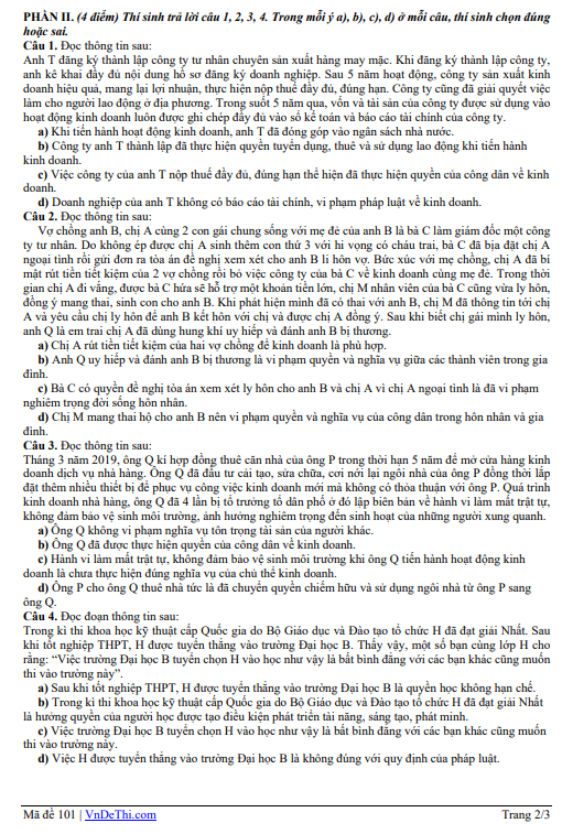 Trắc nghiệm môn KTPL 12 trong đề giữa kì 2 đóng vai trò quan trọng trong việc giúp học sinh làm quen với cấu trúc đề thi chính thức và rèn luyện kỹ năng phân tích, xử lý tình huống pháp luật. Khi ôn luyện đề thi này trên nền tảng detracnghiem.edu.vn, học sinh có thể thực hành làm bài trực tuyến, kiểm tra đáp án ngay sau khi hoàn thành và theo dõi tiến độ học tập của bản thân. Đề thi không chỉ hỗ trợ ôn tập hiệu quả các nội dung trọng tâm mà còn nâng cao khả năng vận dụng kiến thức GDKT&PL vào thực tiễn đời sống. Đây là tài liệu tham khảo hữu ích cho học sinh lớp 12 trong quá trình chuẩn bị cho bài kiểm tra học kì, đặc biệt là Trắc nghiệm ôn tập lớp 12.