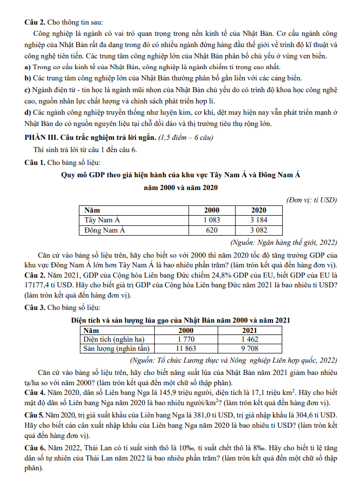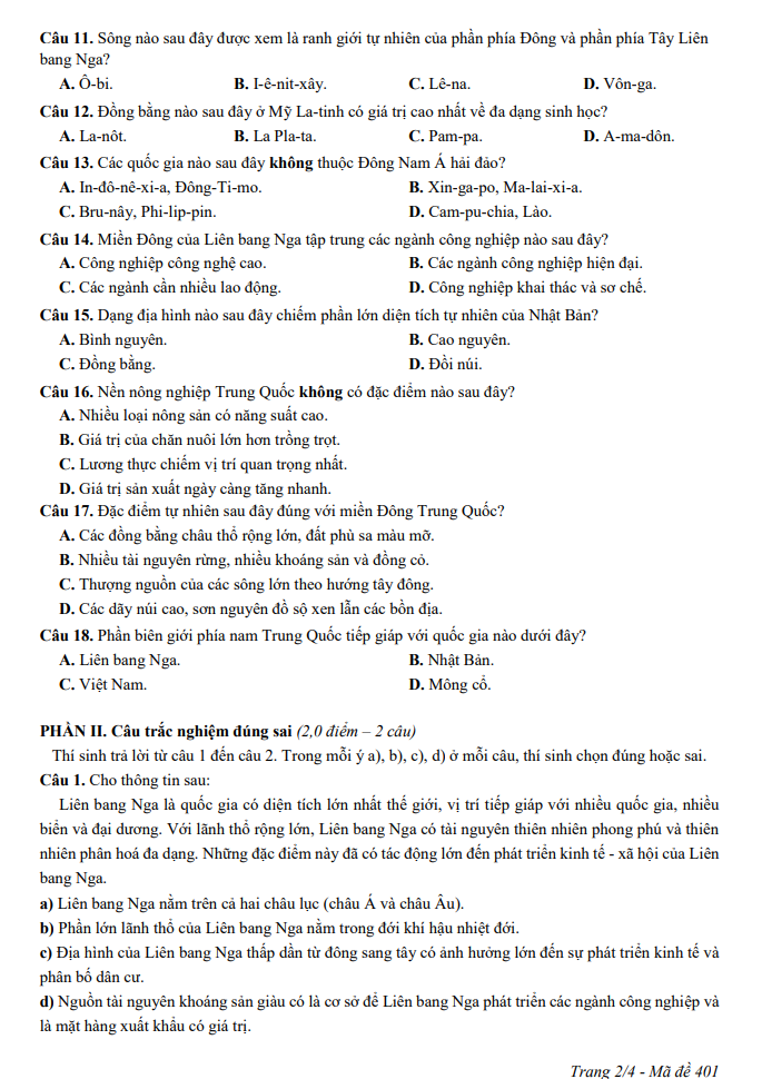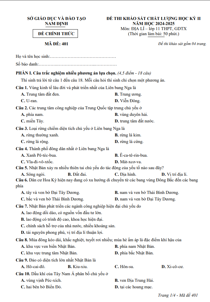 Đề thi học kỳ 2 Địa lí 11 năm 2024 – 2025 sở GDĐT Nam Định