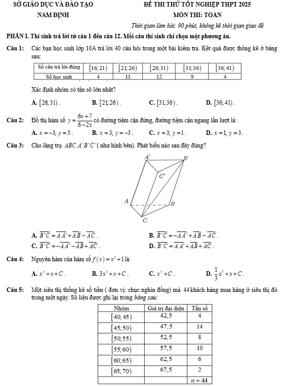 Đề thi thử đại học 2025 môn Toán Sở GD&ĐT Nam Định lần 1