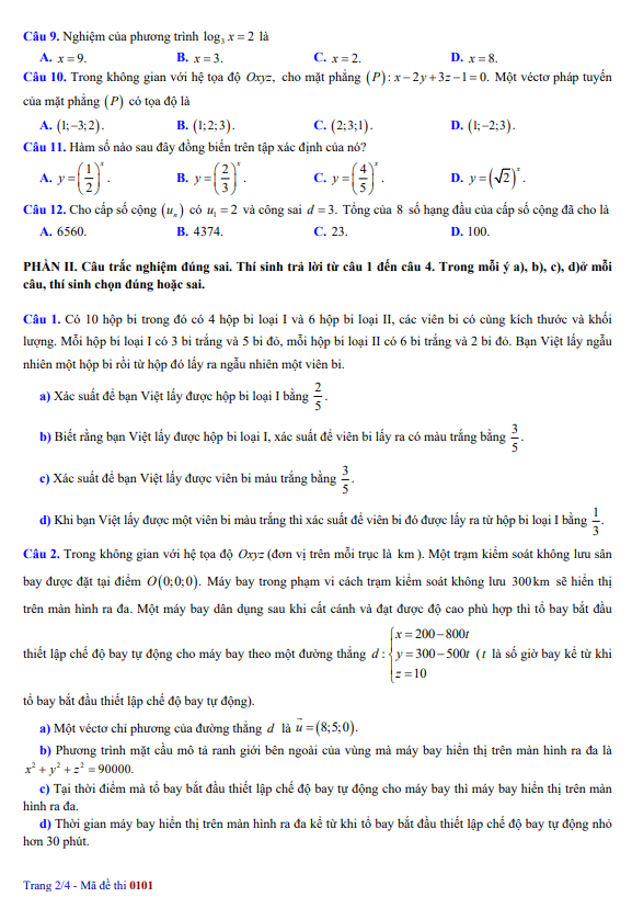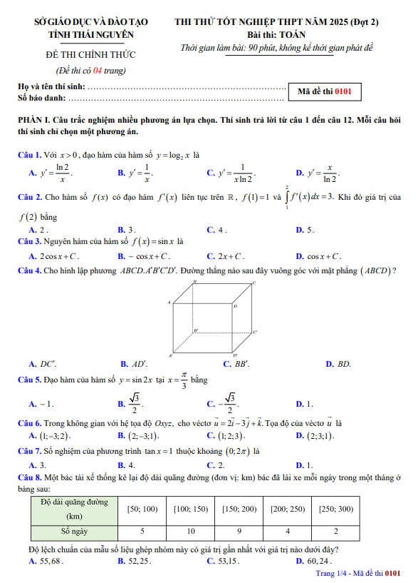 Đề thi thử đại học 2025 môn Toán Sở GD&ĐT Thái Nguyên lần 2 Mã 0101