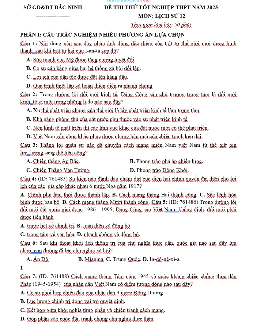 Đề Thi Thử Tốt Nghiệp 2025 Lịch Sử Sở GD Bắc Ninh Giải Chi Tiết