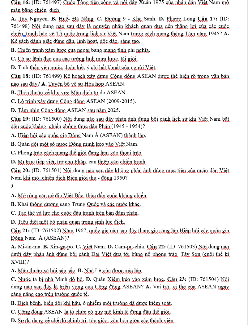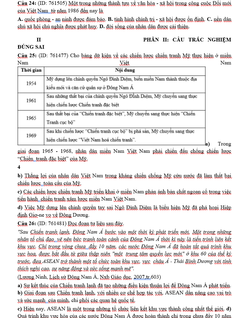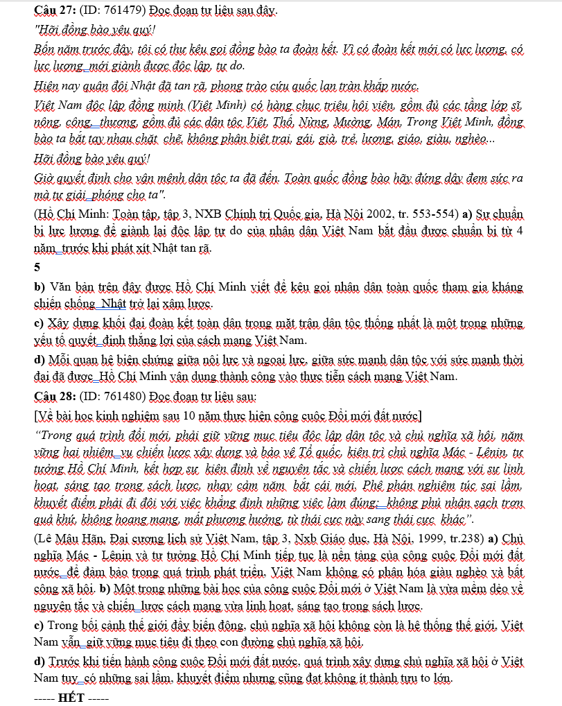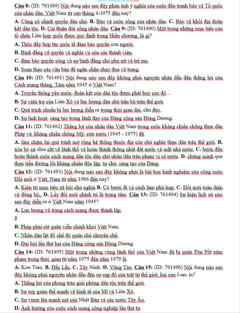 Đề thi được xây dựng theo đúng định hướng của Bộ GD&ĐT, bao quát các chuyên đề trọng tâm như: lịch sử Việt Nam hiện đại, các cuộc vận động cách mạng, hai cuộc kháng chiến, công cuộc đổi mới và những sự kiện có ảnh hưởng lớn trong lịch sử thế giới. Với phần giải chi tiết được trình bày trên Dethitracnghiem.vn, học sinh có thể nắm chắc phương pháp phân tích câu hỏi, tư duy lựa chọn đáp án và tối ưu hiệu quả ôn tập trong giai đoạn nước rút.