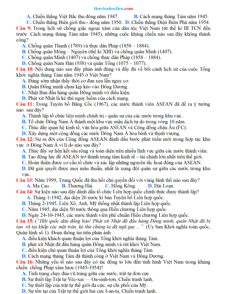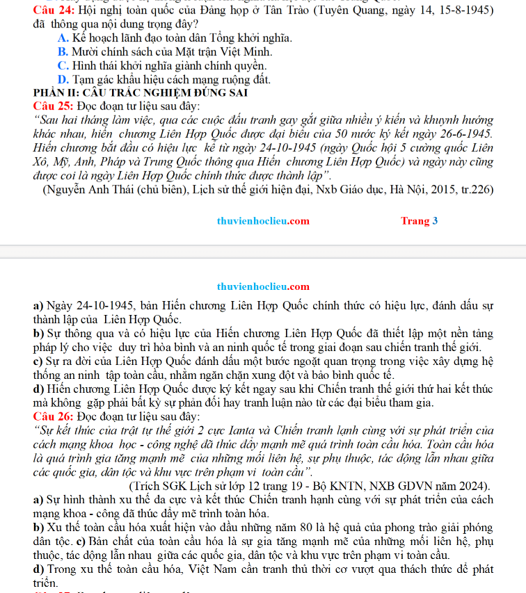 Đề thi được biên soạn bám sát cấu trúc và định hướng của Bộ GD&ĐT, bao quát các chuyên đề trọng tâm của môn Lịch sử như: lịch sử Việt Nam hiện đại, các cuộc kháng chiến, cách mạng, quá trình xây dựng và bảo vệ Tổ quốc, cùng những mốc sự kiện tiêu biểu trong lịch sử thế giới. Nội dung giải chi tiết được trình bày rõ ràng trên Dethitracnghiem.vn giúp học sinh nắm chắc phương pháp phân tích câu hỏi, lựa chọn đáp án và nâng cao kỹ năng tư duy lịch sử trong quá trình ôn tập.