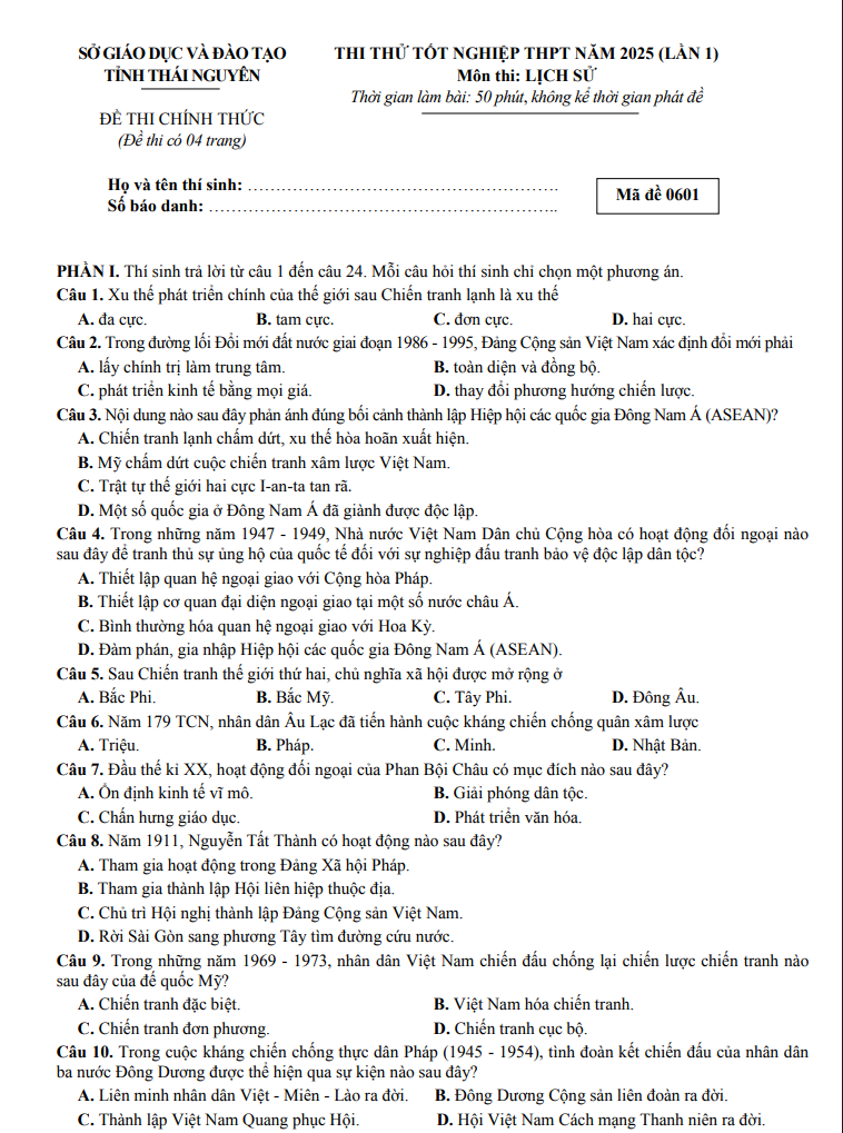 Đề Thi Thử Tốt Nghiệp THPT 2025 Lần 1 Môn Lịch Sử Sở GDĐT Thái Nguyên Có Đáp Án