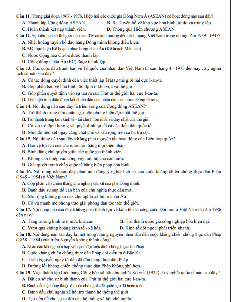 Đề thi được biên soạn bám sát định hướng cấu trúc của Bộ GD&ĐT, bao quát những nội dung trọng tâm như: lịch sử Việt Nam hiện đại, các phong trào giải phóng dân tộc, hai cuộc kháng chiến, quá trình xây dựng – bảo vệ đất nước, cùng các sự kiện nổi bật trong lịch sử thế giới. Các câu hỏi được thiết kế theo nhiều mức độ, giúp học sinh nâng cao tư duy phân tích – tổng hợp và tối ưu hóa kỹ năng xử lý câu hỏi trắc nghiệm trong quá trình ôn tập.