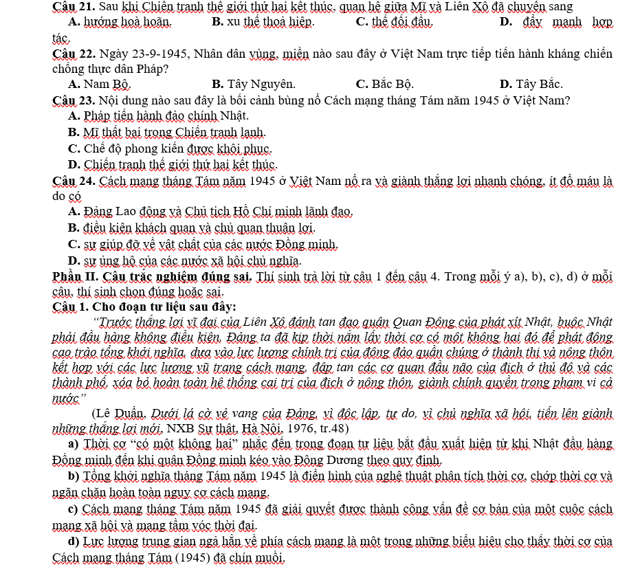 Đề Thi Thử Tốt Nghiệp THPT 2025 Lịch Sử Liên Trường Bắc Ninh Lần 1 Có Đáp Án