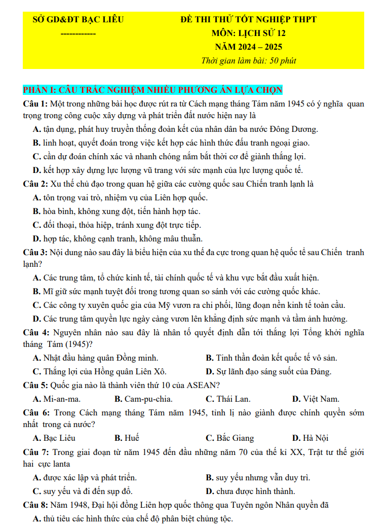 Đề thi thử tốt nghiệp THPT 2025 Lịch Sử Sở GD Bạc Liệu – có lời giải