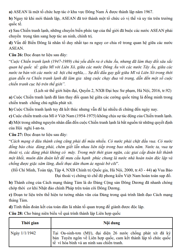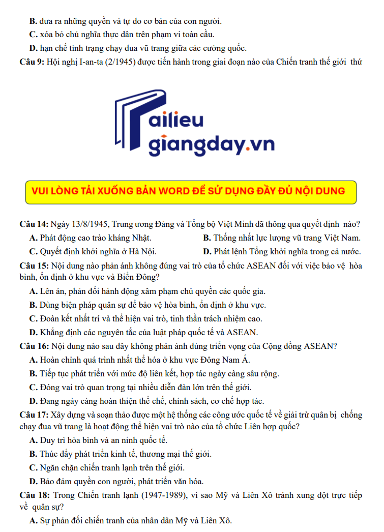 Đề thi được xây dựng theo định hướng cấu trúc của Bộ GD&ĐT, bao quát các chủ đề trọng tâm: lịch sử Việt Nam hiện đại, phong trào cách mạng, hai cuộc kháng chiến, quá trình xây dựng và đổi mới đất nước, cùng những sự kiện có sức ảnh hưởng lớn trong lịch sử thế giới. Hệ thống câu hỏi được phân bố theo nhiều mức độ, hỗ trợ học sinh rèn tư duy phân tích, tổng hợp và gia tăng hiệu quả ôn luyện trong giai đoạn chuẩn bị cho kỳ thi THPT năm 2025.