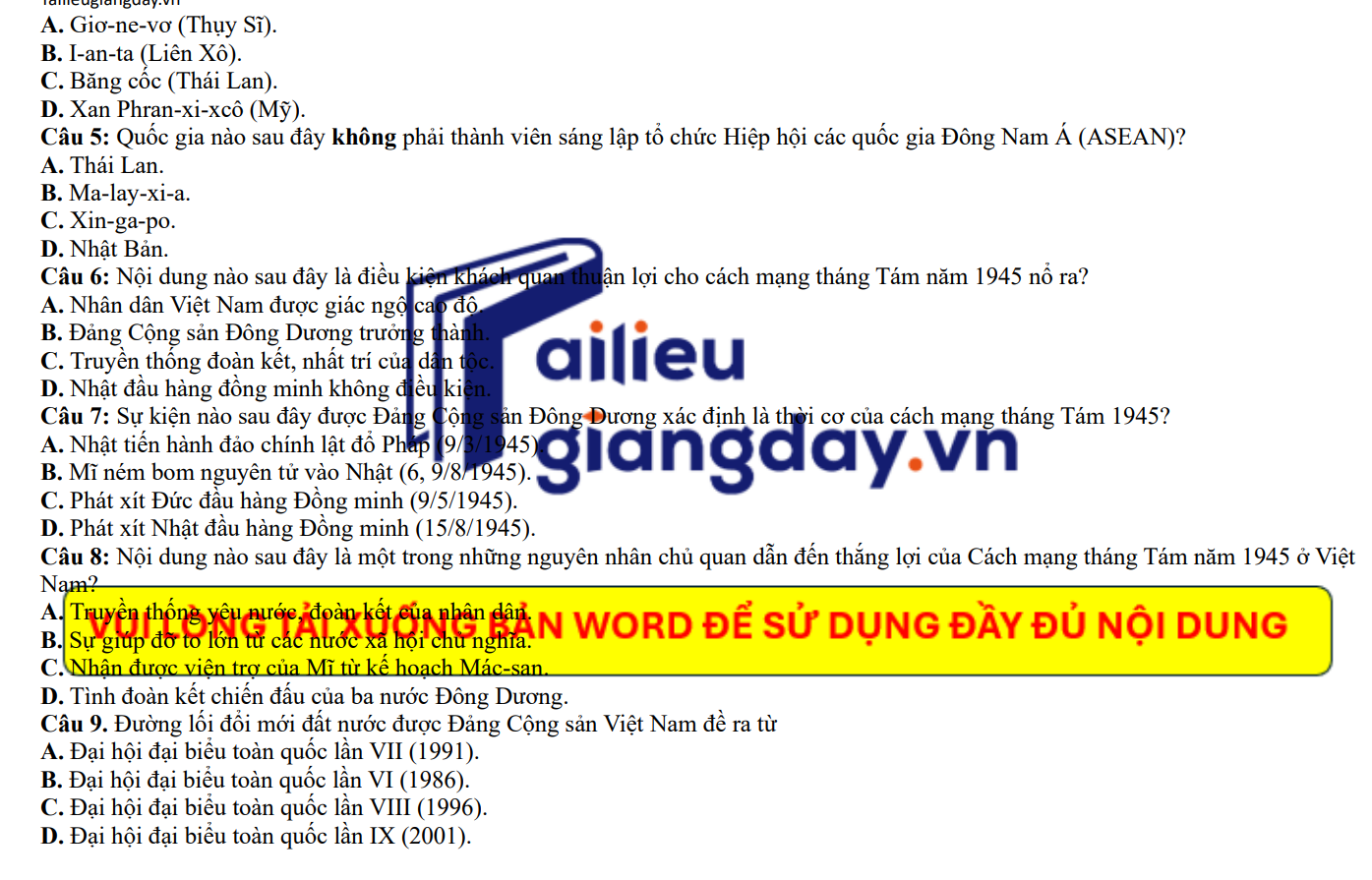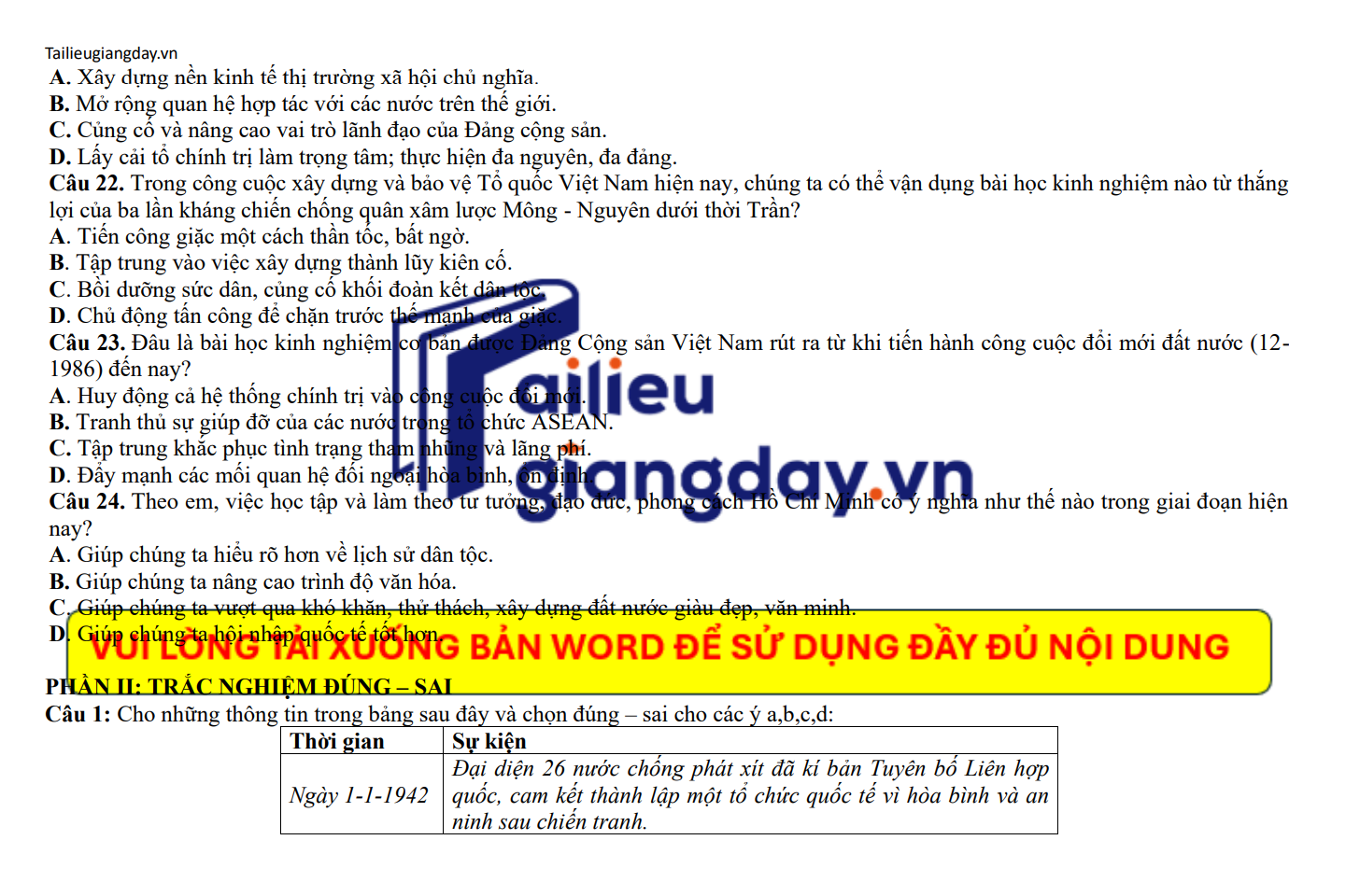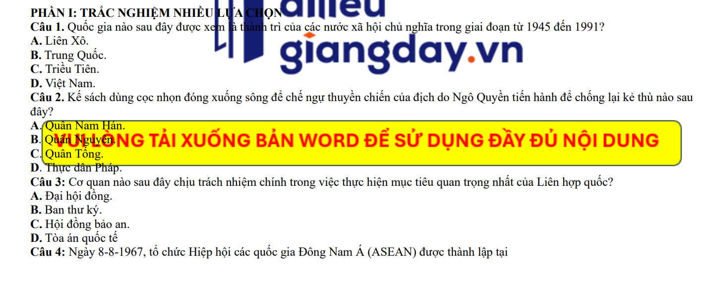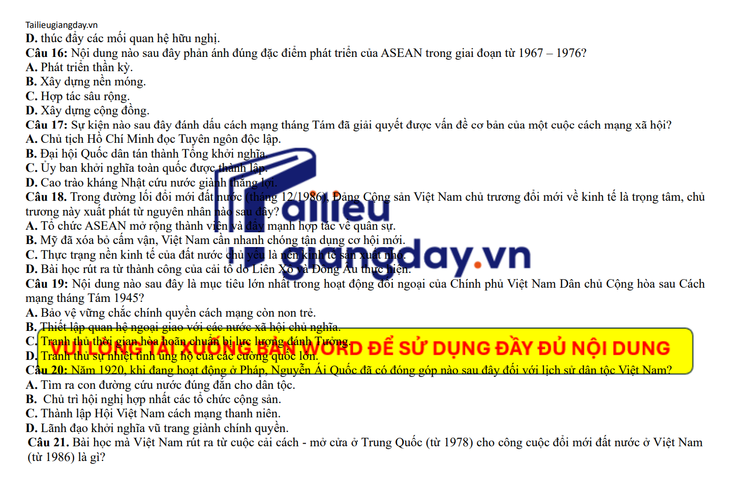 Đề thi được biên soạn dựa trên định hướng và cấu trúc của Bộ GD&ĐT, bao gồm các nội dung trọng tâm như: lịch sử Việt Nam hiện đại, các cuộc vận động cách mạng, hai cuộc kháng chiến, quá trình xây dựng – bảo vệ đất nước, cùng những sự kiện có ảnh hưởng lớn trong lịch sử thế giới. Hệ thống câu hỏi được bố trí theo nhiều cấp độ, giúp học sinh rèn luyện tư duy phân tích, khả năng tổng hợp thông tin và nâng cao hiệu quả làm bài trong giai đoạn chuẩn bị cho kỳ thi THPT năm 2025.