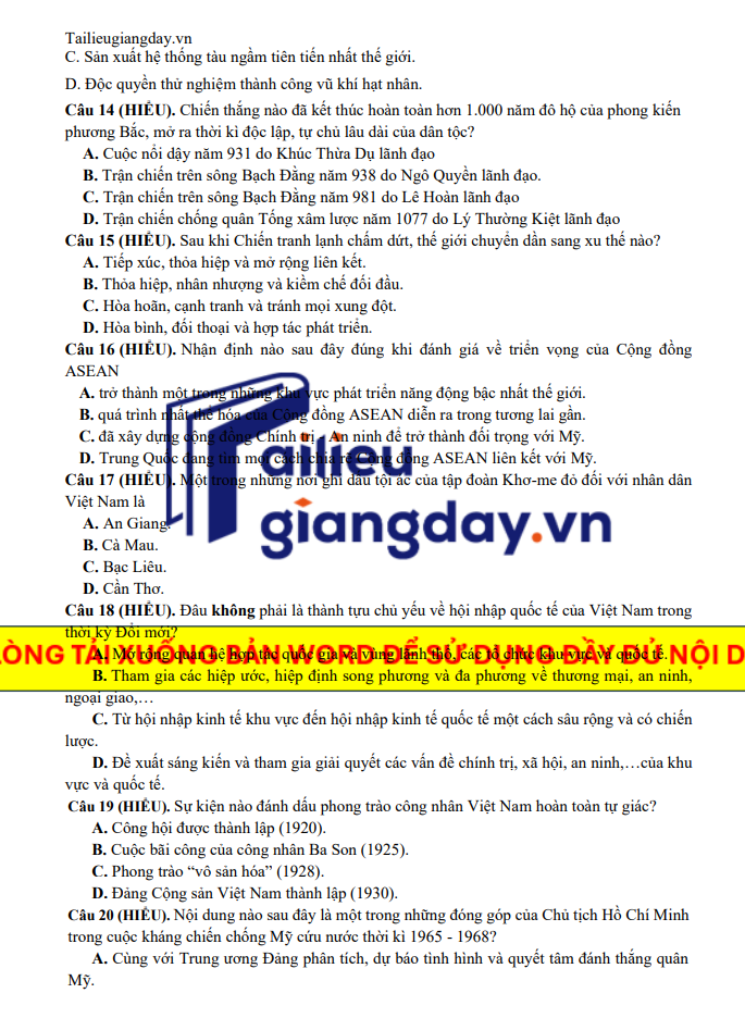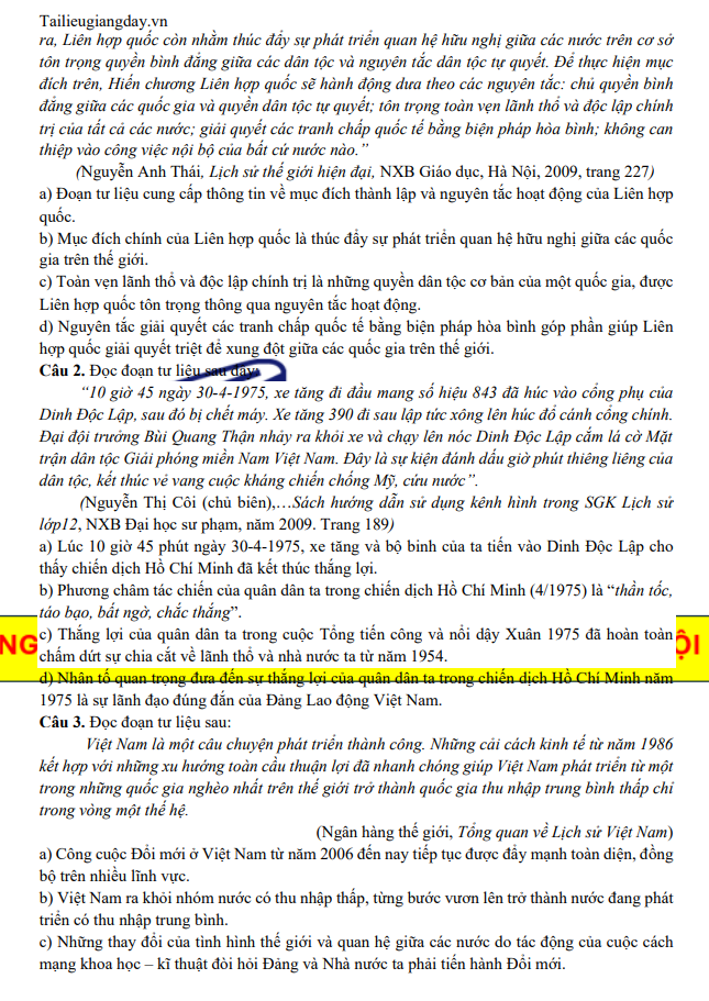 Đề thi được thiết kế bám sát định hướng cấu trúc của Bộ GD&ĐT, bao gồm các chuyên đề chính: lịch sử Việt Nam hiện đại, các cuộc vận động cách mạng, quá trình đấu tranh giành độc lập dân tộc, hai cuộc kháng chiến, công cuộc xây dựng – đổi mới đất nước, cùng những sự kiện có tác động lớn đến lịch sử thế giới. Hệ thống câu hỏi được phân chia theo nhiều mức độ giúp học sinh rèn kỹ năng phân tích, tổng hợp và nâng cao hiệu quả làm bài trong quá trình ôn luyện cho kỳ thi THPT năm 2025.