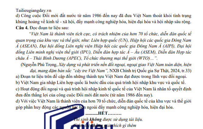 Đề thi thử tốt nghiệp THPT 2025 Lịch Sử THPT Thọ Xuân – Đồng Nai – có đáp án