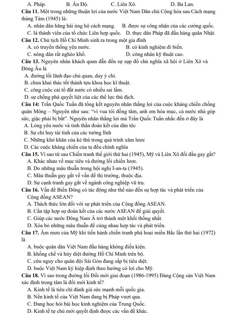 Đề thi được biên soạn dựa trên định hướng ma trận đề của Bộ GD&ĐT, bao gồm các chuyên đề trọng yếu: lịch sử Việt Nam hiện đại, tiến trình đấu tranh giành độc lập dân tộc, hai cuộc kháng chiến, công cuộc xây dựng – bảo vệ Tổ quốc, cùng những sự kiện tiêu biểu trong lịch sử thế giới. Hệ thống câu hỏi được bố trí theo nhiều cấp độ, giúp học sinh phát triển tư duy phân tích, làm quen với dạng câu hỏi trắc nghiệm và nâng cao hiệu quả ôn luyện trong quá trình chuẩn bị cho kỳ thi THPT năm 2025.