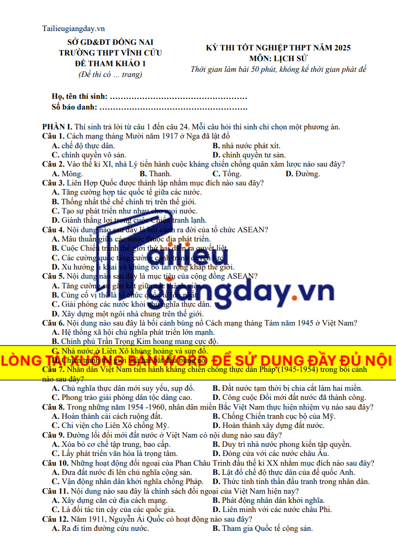 Đề thi thử tốt nghiệp THPT 2025 Lịch Sử THPT Vĩnh Cửu – Đồng Nai – có đáp án
