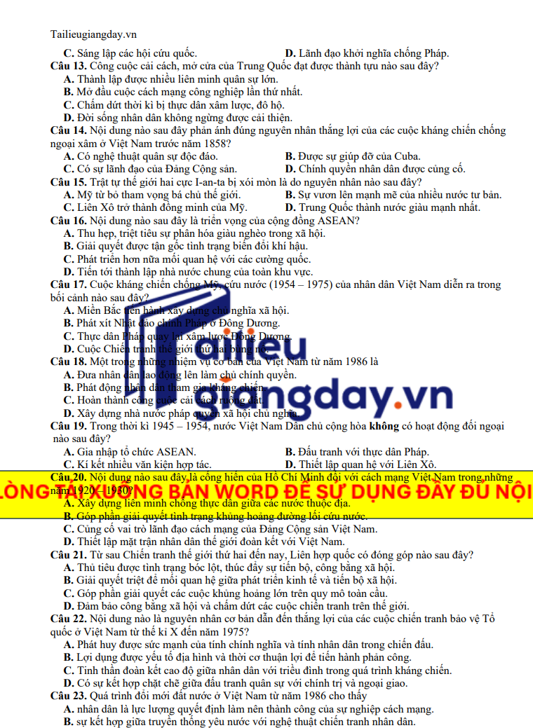 Đề thi được biên soạn bám sát định hướng cấu trúc của Bộ GD&ĐT, bao gồm các chuyên đề trọng tâm: lịch sử Việt Nam hiện đại, phong trào đấu tranh giành độc lập dân tộc, hai cuộc kháng chiến, công cuộc xây dựng – bảo vệ Tổ quốc, cùng những sự kiện tiêu biểu trong lịch sử thế giới. Hệ thống câu hỏi được phân chia theo nhiều mức độ, giúp học sinh phát triển tư duy phân tích, tổng hợp tư liệu và nâng cao hiệu quả làm bài trong quá trình ôn luyện hướng đến kỳ thi THPT năm 2025.
