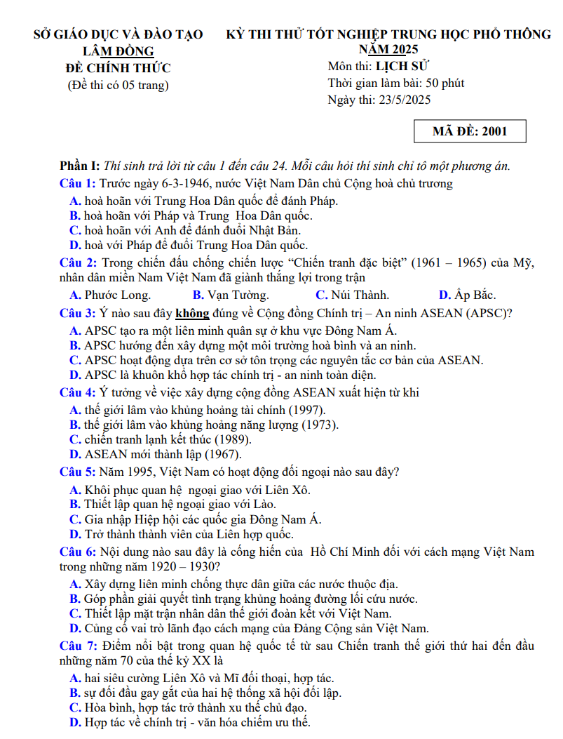 Đề thi thử tốt nghiệp THPT 2025 môn Lịch sử sở GDĐT Lâm Đồng
