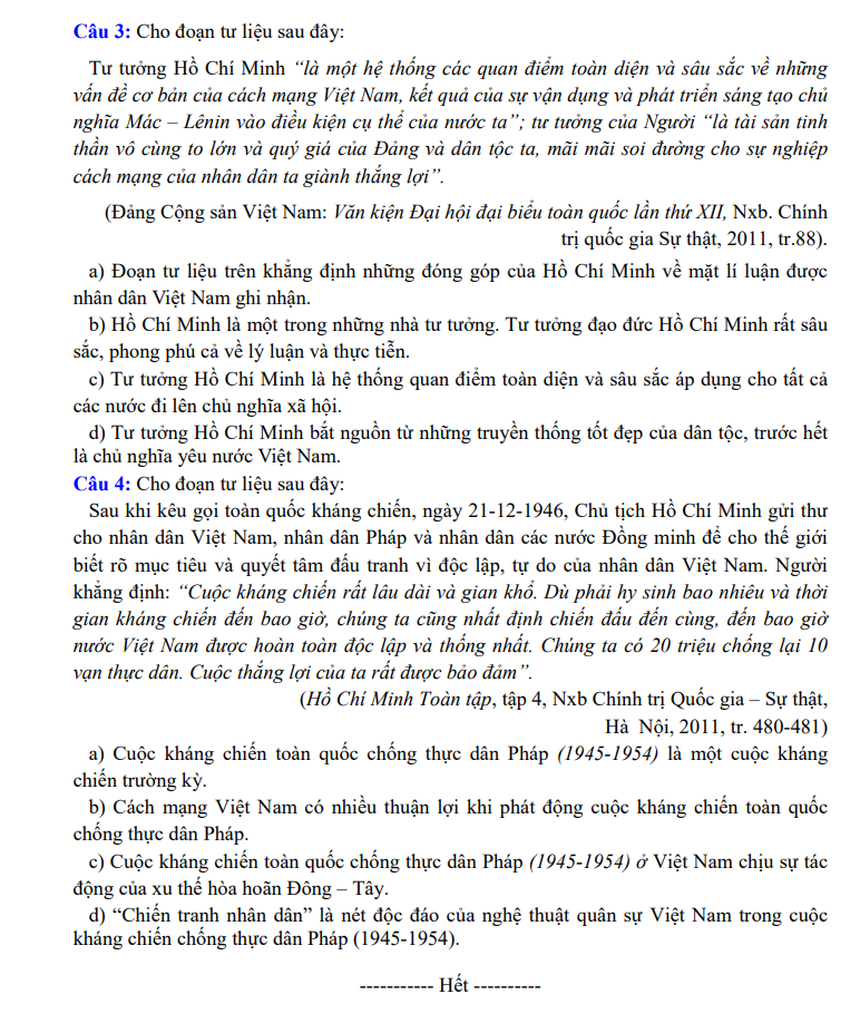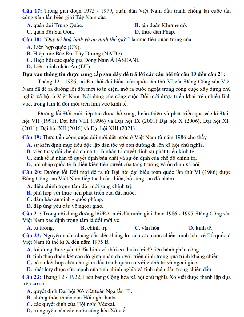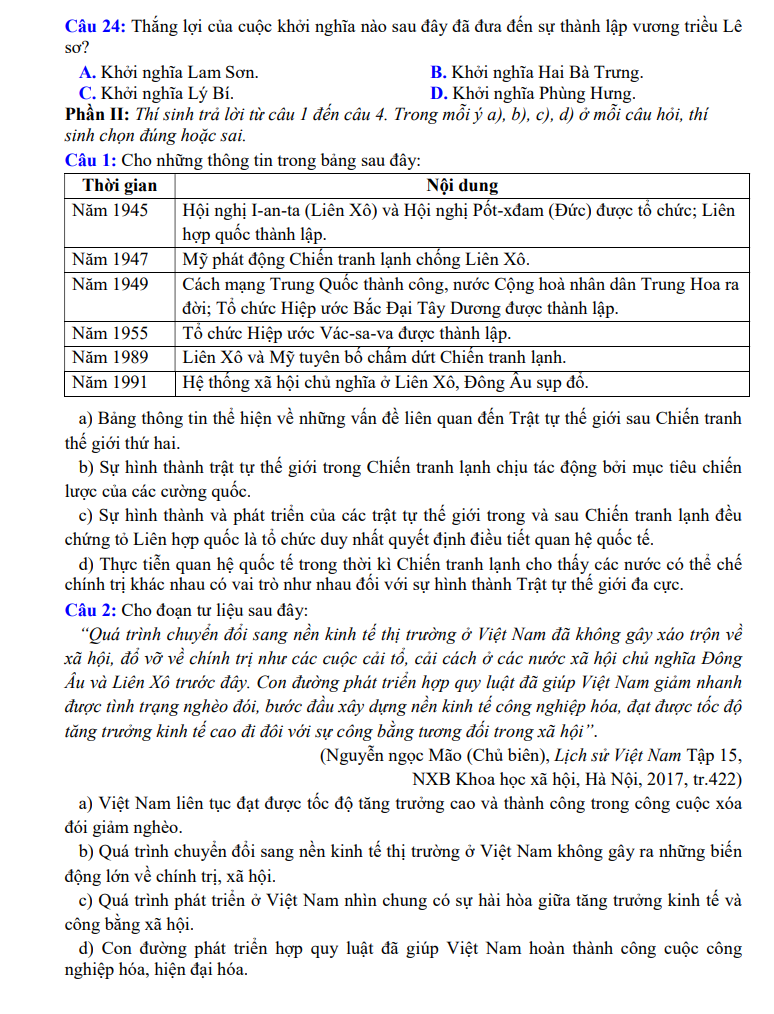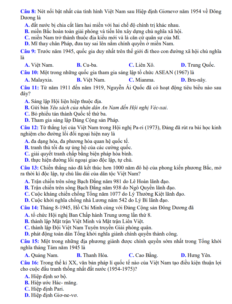 Đề thi được xây dựng bám sát định hướng và ma trận của Bộ GD&ĐT, bao phủ các chuyên đề trọng tâm của chương trình Lịch sử: lịch sử Việt Nam hiện đại, cách mạng tháng Tám, kháng chiến chống Pháp – chống Mỹ, công cuộc đổi mới, lịch sử thế giới hiện đại và các sự kiện mang tính bước ngoặt. Hệ thống câu hỏi được phân chia theo nhiều mức độ từ nhận biết, thông hiểu đến vận dụng, giúp học sinh củng cố kiến thức lẫn kỹ năng phân tích – tổng hợp.