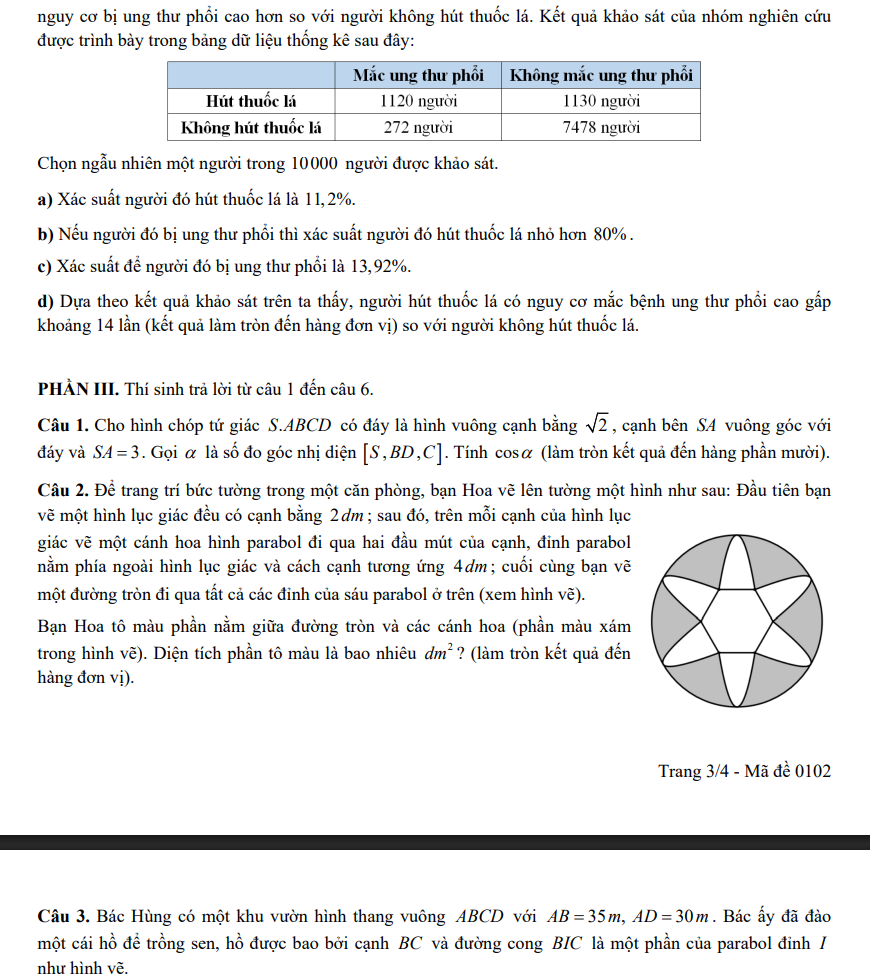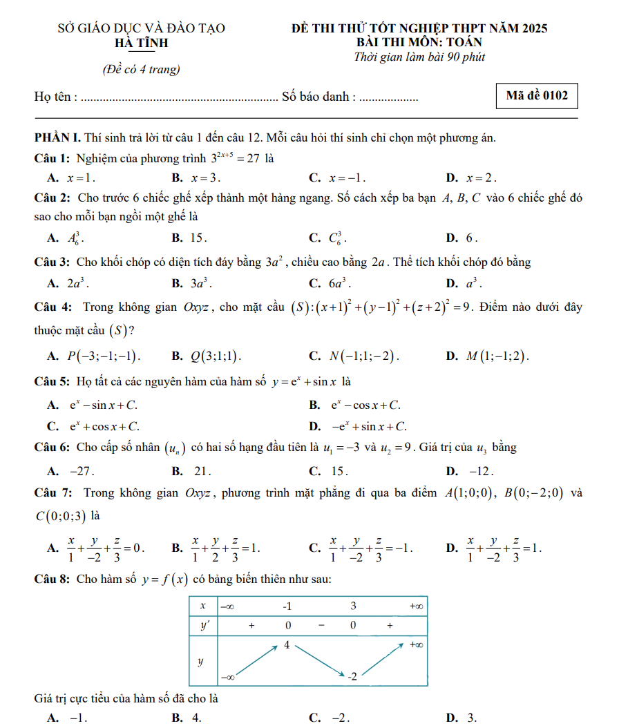 Đề thi thử tốt nghiệp THPT 2025 môn Toán sở GDĐT Hà Tĩnh Mã Đề 0102