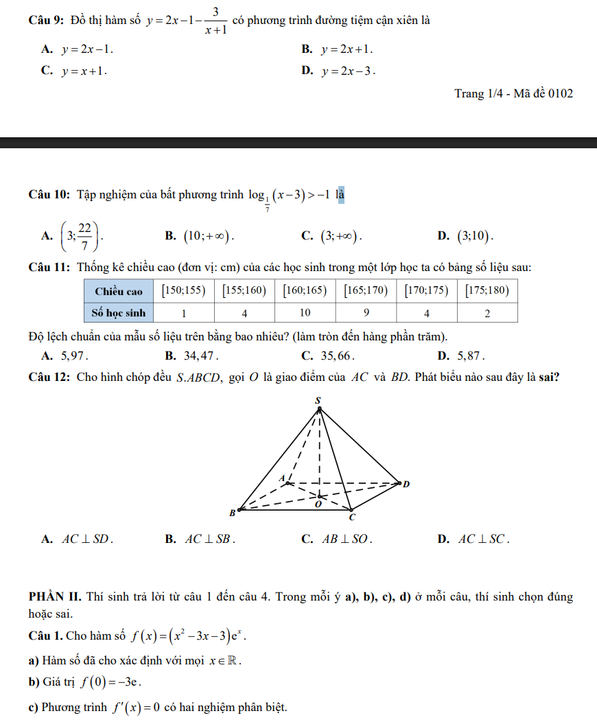 Đề thi thử tốt nghiệp THPT 2025 môn Toán – Sở GD&ĐT Hà Tĩnh (Mã đề 0102) thuộc bộ đề trong chương trình Thi thử Toán THPT và được đăng tải tại chuyên mục Ôn tập thi thử THPT, hỗ trợ học sinh lớp 12 củng cố kiến thức, rèn luyện kỹ năng và chuẩn bị cho kỳ thi tốt nghiệp cũng như các kỳ thi chuyển cấp quan trọng.